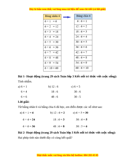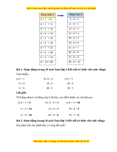 ộ (trang 29 sách Toán l p ớ 3 K t ế n i ố tri th c ứ v i ớ cu c ộ s ng) ố : Tính nhẩm. a) 6 × 1 b) 12 : 6 c) 6 × 5 6 × 4 18 : 6 30 : 6 6 × 6 48 : 6 30 : 5 L i ờ giải: T b ừ ng ả nhân 6 và b ng ả chia 6 đã h c, ọ em đi n đ ề ư c các ợ s nh ố s ư au: Bài 2- Ho t ạ đ ng