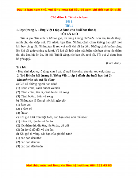 1. Đọc (trang 5, Tiếng Việt 1 tập 2 dành cho buổi học thứ 2) TÔI LÀ GIÓ