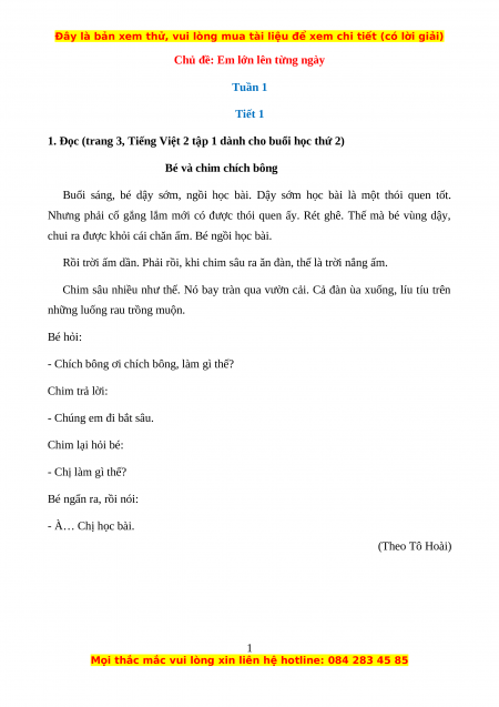 1. Đọc (trang 3, Tiếng Việt 2 tập 1 dành cho buổi học thứ 2)
