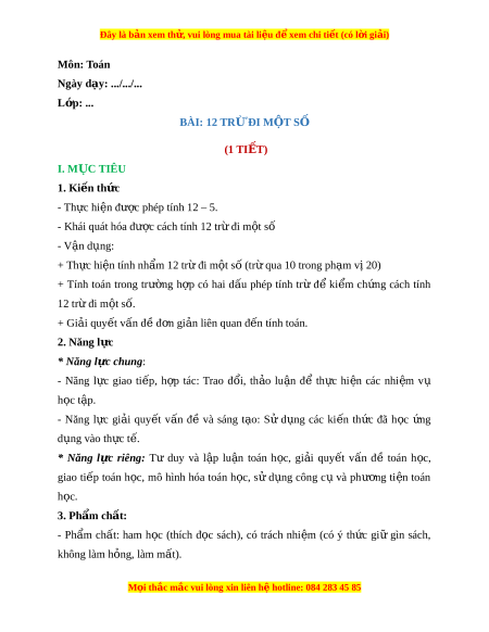 Ngày dạy: .../.../... L p: ớ ... BÀI: 12 TR Đ Ừ I M T Ộ SỐ (1 TIẾT) I. M C Ụ TIÊU 1. Ki n t ế h c ứ - Th c hi ự n đ ệ ư c ợ phép tính 12 – 5. - Khái quát hóa đư c ợ cách tính 12 tr đi ừ m t ộ số - V n ậ d ng: ụ + Th c ự hi n t ệ ính nh m ẩ 12 tr đi ừ m t ộ số (tr qua 10 t ừ rong ph m ạ v 20 ị ) + Tính toán trong trư ng ờ h p ợ có hai d u ấ phép tính trừ đ ể ki m ể ch ng ứ cách tính 12 tr đi ừ m t ộ số. + Gi i ả quy t ế v n đ ấ ề đ n gi ơ n l ả iên quan đ n ế tính toán. 2. Năng l c ự
