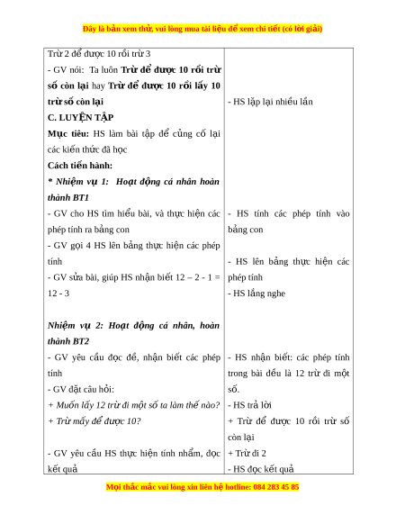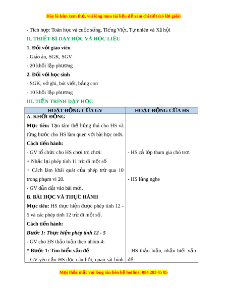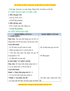 Đây là bản xem th , vu ử i lòng mua tài li u ệ đ xe ể m chi ti t (c ế ó l i ờ gi i ả ) - Tích h p: ợ Toán h c và cu ọ c ộ s ng, ố Ti ng ế Vi t ệ , T nhi ự ên và Xã h i ộ II. THIẾT B D Ị ẠY H C Ọ VÀ H C Ọ LI U Ệ 1. Đ i ố v i ớ giáo viên - Giáo án, SGK, SGV. - 20 kh i ố l p ậ phư ng ơ 2. Đ i ố v i ớ h c s ọ inh - SGK, v ghi ở , bút vi t ế , b ng con ả - 10 kh i ố l p ậ phư ng ơ III. TI N Ế TRÌNH D Y Ạ H C Ọ HOẠT Đ N Ộ G C A Ủ GV HOẠT Đ N Ộ G C A Ủ HS A. KH I Ở Đ N Ộ G Mục tiêu: T o ạ tâm thế h ng ứ thú cho HS và t ng b ừ ư c ớ cho HS làm quen v i ớ bài h c ọ m i ớ . Cách ti n hà ế nh: - GV tổ ch c ứ cho HS ch i ơ trò ch i ơ : - HS cả l p t ớ ham gia chò tr i ơ + Nh c ắ l i ạ phép tính 11 tr đi ừ m t ộ s ố + Cách làm khái quát c a ủ phép trừ qua 10 trong ph m ạ vi 20. - HS l ng ắ nghe - GV d n d ẫ t ắ vào bài m i ớ . B. BÀI H C Ọ VÀ TH C Ự HÀNH Mục tiêu: HS th c ự hi n ệ đư c ợ phép tính 12 -