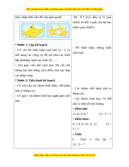 Đây là bản xem th , vu ử i lòng mua tài li u ệ đ xe ể m chi ti t (c ế ó l i ờ gi i ả ) nh, ả nh n bi ậ t ế vấn đ c ề ần gi i ả quy t ế . 12 - 5 ? (Lúc đ u ầ có 12 quả chuối, ăn h t ế 5 qu , ả còn l i ạ bao nhiêu qu chu ả ối?) * Bước 2: Lập k h ế oạch - HS th o ả lu n, ậ th ng ố nh t ấ - GV cho HS th o ả lu n