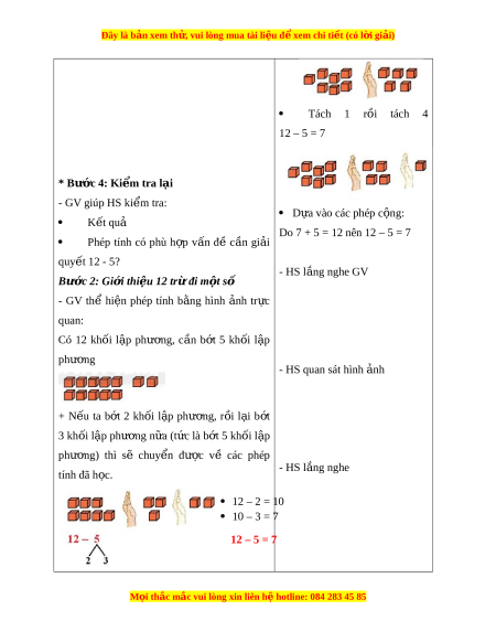 Do 7 + 5 = 12 nên 12 – 5 = 7 Phép tính có phù h p ợ v n ấ đề c n ầ gi i ả quy t ế 12 - 5? - HS l ng ắ nghe GV Bước 2: Gi i ớ thi u 12 t ệ r đi ừ m t ộ số - GV thể hi n ệ phép tính b ng ằ hình nh ả tr c ự quan: Có 12 kh i ố l p ậ phư ng, ơ c n ầ b t ớ 5 kh i ố l p ậ phư ng ơ - HS quan sát hình nh ả + N u ế ta b t ớ 2 kh i ố l p ậ phư ng, ơ r i ồ l i ạ b t ớ 3 khối l p ph ậ ư ng ơ n a ( ữ t c l ứ à b t ớ 5 kh i ố l p ậ phư ng) ơ thì sẽ chuy n ể đư c ợ về các phép - HS l ng ắ nghe tính đã h c. ọ 12 – 2 = 10 10 – 3 = 7 12 – 5 = 7 M i