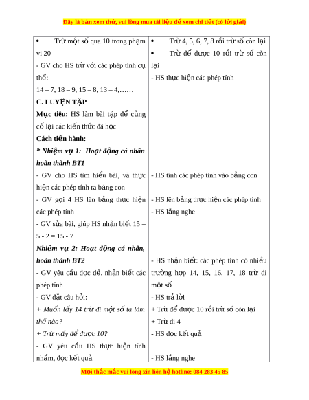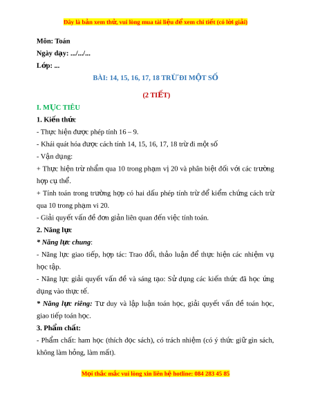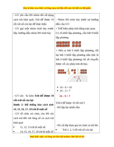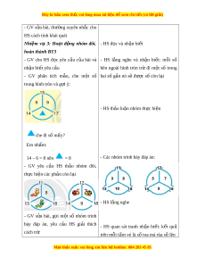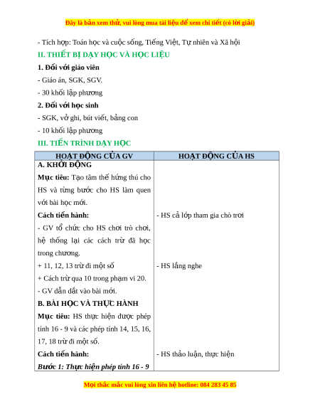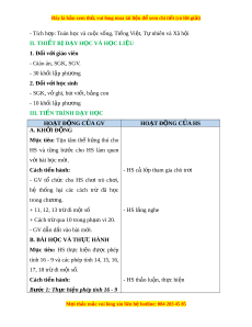 Đây là bản xem th , vu ử i lòng mua tài li u ệ đ xe ể m chi ti t (c ế ó l i ờ gi i ả ) - Tích h p: ợ Toán h c và cu ọ c ộ s ng, ố Ti ng ế Vi t ệ , T nhi ự ên và Xã h i ộ II. THIẾT B D Ị ẠY H C Ọ VÀ H C Ọ LI U Ệ 1. Đ i ố v i ớ giáo viên - Giáo án, SGK, SGV. - 30 kh i ố l p ậ phư ng ơ 2. Đ i ố v i ớ h c s ọ inh - SGK, v ghi ở , bút vi t ế , b ng con ả - 10 kh i ố l p ậ phư ng ơ III. TI N Ế TRÌNH D Y Ạ H C Ọ HOẠT Đ N Ộ G C A Ủ GV HOẠT Đ N Ộ G C A Ủ HS A. KH I Ở Đ N Ộ G Mục tiêu: T o ạ tâm thế h ng ứ thú cho HS và t ng ừ bư c ớ cho HS làm quen v i ớ bài h c m ọ i ớ . Cách ti n hà ế nh: - HS c l ả p ớ tham gia chò tr i ơ - GV tổ ch c ứ cho HS ch i ơ trò ch i ơ , hệ th ng ố l i ạ các cách trừ đã h c ọ trong chư ng. ơ + 11, 12, 13 tr đi ừ m t ộ số - HS l ng nghe ắ