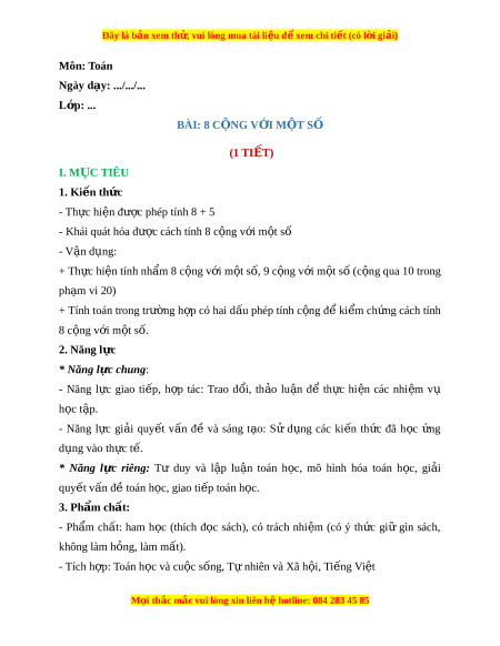 Ngày dạy: .../.../... L p: ớ ... BÀI: 8 C N Ộ G V I Ớ M T Ộ SỐ (1 TIẾT) I. M C Ụ TIÊU 1. Ki n t ế h c ứ - Th c hi ự n đ ệ ư c ợ phép tính 8 + 5 - Khái quát hóa đư c ợ cách tính 8 c ng ộ v i ớ m t ộ số - V n ậ d ng: ụ + Th c ự hi n t ệ ính nh m ẩ 8 c ng v ộ i ớ m t ộ s , ố 9 c ng v ộ i ớ m t ộ s ( ố c ng qua ộ 10 trong ph m ạ vi 20) + Tính toán trong trư ng ờ h p ợ có hai d u ấ phép tính c ng ộ đ ki ể m ể ch ng ứ cách tính 8 c ng ộ v i ớ m t ộ số. 2. Năng l c ự