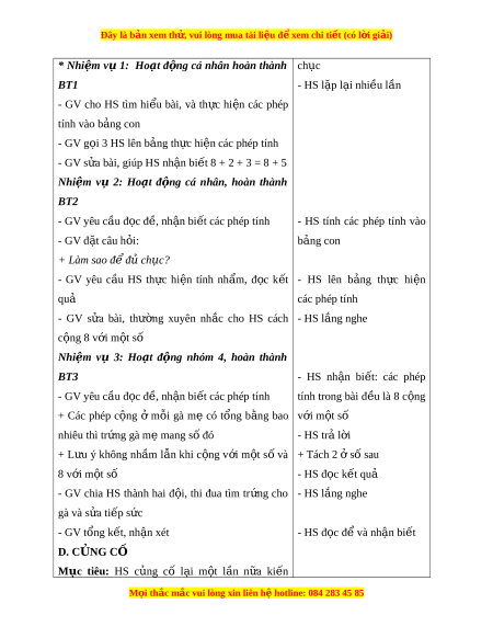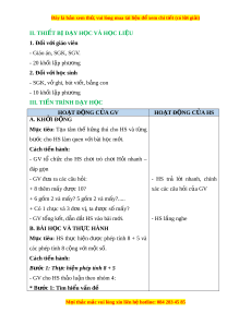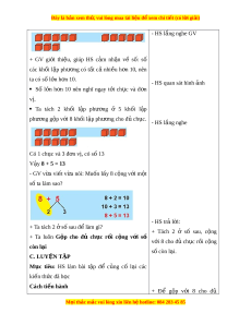 Đây là bản xem th , vu ử i lòng mua tài li u ệ đ xe ể m chi ti t (c ế ó l i ờ gi i ả ) II. THIẾT B D Ị ẠY H C Ọ VÀ H C Ọ LI U Ệ 1. Đ i ố v i ớ giáo viên - Giáo án, SGK, SGV. - 20 kh i ố l p ậ phư ng ơ 2. Đ i ố v i ớ h c s ọ inh - SGK, v ghi ở , bút vi t ế , b ng con ả - 10 kh i ố l p ậ phư ng ơ III. TI N Ế TRÌNH D Y Ạ H C Ọ HOẠT Đ N Ộ G C A Ủ GV HOẠT Đ N Ộ G C A Ủ HS A. KH I Ở Đ N Ộ G Mục tiêu: T o ạ tâm thế h ng ứ thú cho HS và t ng ừ bư c ớ cho HS làm quen v i ớ bài h c ọ m i ớ . Cách ti n hà ế nh: - GV tổ ch c ứ cho HS ch i ơ trò ch i ơ H i ỏ nhanh – đáp g n ọ - GV đ a r ư a các câu h i ỏ : - HS trả l i ờ nhanh, chính + 8 thêm m y đ ấ ư c 10? ợ xác các câu h i ỏ c a ủ GV + 6 gồm 2 và m y? 5 g ấ ồm 2 và m y?..... ấ + Có 1 ch c và 3 đ ụ n ơ v , t ị a đư c ợ s m ố y? ấ - GV tổng k t ế , d n d ẫ t ắ HS vào bài m i ớ . - HS l ng ắ nghe B. BÀI H C Ọ VÀ TH C Ự HÀNH Mục tiêu: HS th c ự hi n ệ đư c ợ phép tính 8 + 5 và các phép tính 8 c ng v ộ i ớ m t ộ số. Cách ti n hà ế nh: