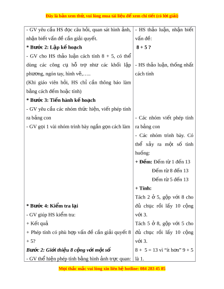 Đây là bản xem th , vu ử i lòng mua tài li u ệ đ xe ể m chi ti t (c ế ó l i ờ gi i ả ) - HS l ng ắ nghe GV + GV gi i ớ thi u, ệ giúp HS c m ả nh n ậ về s : ố số các kh i ố l p ậ phư ng ơ có t t ấ c ả nhi u ề h n ơ 10, nên ta có số l n h ớ n 10. ơ - HS quan sát hình nh ả Số l n ớ h n ơ 10 nên nghĩ ngay t i ớ ch c ụ và đ n ơ vị. Ta tách 2 kh i ố l p ậ phư ng ơ ở 5 kh i ố l p ậ phư ng ơ g p v ộ i ớ 8 kh i ố l p ph ậ ư ng ơ cho đ ch ủ c. ụ - HS l ng ắ nghe Có 1 ch c và 3 đ ụ n ơ v , có ị s 13 ố V y ậ 8 + 5 = 13 - GV v a vi ừ t ế v a ừ nói: Mu n ố l y ấ 8 c ng ộ v i ớ m t ộ số ta làm sao? - HS tr l ả i ờ : + Ta tách 2 s ở ố sau đ l ể àm gì? + Tách 2 ở số sau, c ng ộ + Ta luôn G p ộ cho đủ ch c ụ r i ồ c ng ộ v i