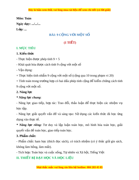 Ngày dạy: .../.../... L p: ớ ... BÀI: 9 C N Ộ G V I Ớ M T Ộ SỐ (1 TIẾT) I. M C Ụ TIÊU 1. Ki n t ế h c ứ - Th c hi ự n đ ệ ư c ợ phép tính 9 + 5 - Khái quát hóa đư c ợ cách tính 9 c ng ộ v i ớ m t ộ số - V n ậ d ng: ụ + Th c ự hi n t ệ ính nh m ẩ 9 c ng v ộ i ớ m t ộ số (c ng ộ qua 10 trong ph m ạ vi 20) + Tính toán trong trư ng ờ h p ợ có hai d u ấ phép tính c ng ộ đ ki ể m ể ch ng ứ cách tính 9 c ng ộ v i ớ m t ộ số. 2. Năng l c ự