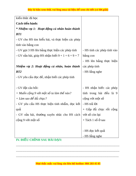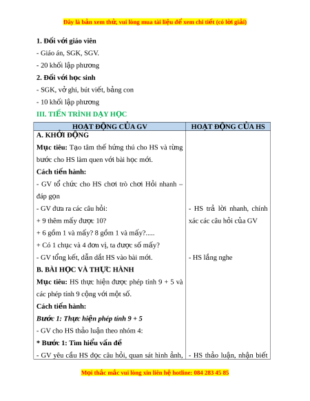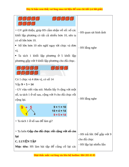 Đây là bản xem th , vu ử i lòng mua tài li u ệ đ xe ể m chi ti t (c ế ó l i ờ gi i ả ) 1. Đ i ố v i ớ giáo viên - Giáo án, SGK, SGV. - 20 kh i ố l p ậ phư ng ơ 2. Đ i ố v i ớ h c s ọ inh - SGK, v ghi ở , bút vi t ế , b ng con ả - 10 kh i ố l p ậ phư ng ơ III. TI N Ế TRÌNH D Y Ạ H C Ọ HOẠT Đ N Ộ G C A Ủ GV HOẠT Đ N Ộ G C A Ủ HS A. KH I Ở Đ N Ộ G Mục tiêu: T o ạ tâm thế h ng ứ thú cho HS và t ng ừ bư c ớ cho HS làm quen v i ớ bài h c ọ m i ớ . Cách ti n hà ế nh: - GV tổ ch c ứ cho HS ch i ơ trò ch i ơ H i ỏ nhanh – đáp g n ọ - GV đ a r ư a các câu h i ỏ : - HS trả l i ờ nhanh, chính + 9 thêm m y đ ấ ư c 10? ợ xác các câu h i ỏ c a G ủ V + 6 gồm 1 và m y? 8 g ấ ồm 1 và m y?..... ấ + Có 1 ch c và 4 đ ụ n ơ v , t ị a đư c ợ s m ố y? ấ - GV tổng k t ế , d n d ẫ t ắ HS vào bài m i ớ . - HS l ng nghe ắ B. BÀI H C Ọ VÀ TH C Ự HÀNH Mục tiêu: HS th c ự hi n ệ đư c ợ phép tính 9 + 5 và các phép tính 9 c ng v ộ i ớ m t ộ số. Cách ti n hà ế nh: