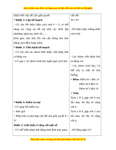 ọ 1 vài nhóm trình bày ng n ắ g n cách ọ làm ra b ng ả con - Các nhóm trình bày. Có thể x y ả ra m t ộ số tình huống: + Đ m ế : Đ m ế từ 1 đ n 14 ế Đ m ế từ 9 đ n 14 ế Đ m ế từ 5 đ n 14 ế + Tính: Tách 1 ở 5, g p ộ v i ớ 9 cho * Bước 4: Ki m ể tra l i ạ đủ ch c ụ r i ồ l y ấ 10 c ng ộ - GV giúp HS ki m ể tra: v i ớ 4. + K t ế quả Tách 5 ở 9, g p ộ v i ớ 5 cho + Phép tính có phù h p ợ v n ấ đ c ề n ầ gi i ả quy t ế 9 + đủ ch c ụ r i ồ l y ấ 10 c ng ộ 5? v i ớ 4. Bước 2: Gi i ớ thi u 9 c ệ ng v ộ i ớ m t ộ số - GV thể hi n phép ệ tính b ng ằ hình nh t ả r c quan: ự - HS l ng nghe G ắ V M i