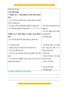 dùng các công cụ hỗ trợ như các kh i ố l p ậ - HS th o ả lu n, ậ th ng ố nh t ấ phư ng, ơ ngón tay, hình v ,….. ẽ cách tính (Khi giáo viên h i ỏ , HS chỉ c n ầ thông báo làm b ng ằ cách đ m ế hoặc tính) * Bước 3: Ti n hà ế nh k ho ế ch ạ - GV yêu c u ầ các nhóm th c ứ hi n, ệ vi t ế phép tính ra b ng ả con - Các nhóm vi t ế phép tính - GV g i