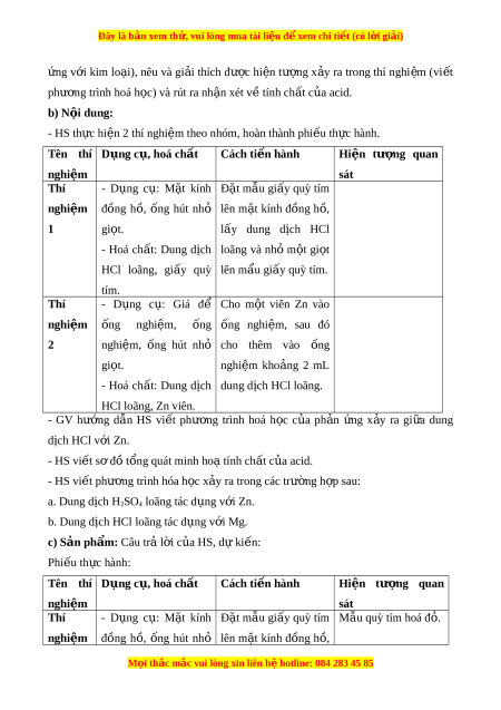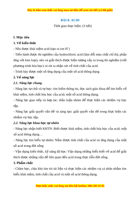 Đây là bản xem th , vu ử i lòng mua tài li u ệ đ xe ể m chi ti t ế (có l i ờ gi i ả ) BÀI 8: ACID Th i ờ gian th c hi ự n: ệ (3 ti t ế ) I. M c t ụ iêu 1. V ki ề n t ế h c ứ - Nêu đư c ợ khái ni m ệ acid (t o ạ ra ion H+) - Ti n ế hành đư c ợ thí nghi m ệ c a