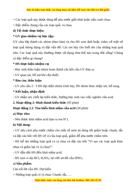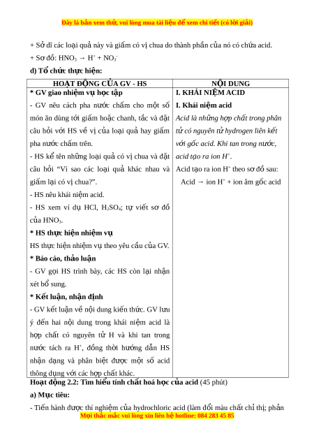 Đây là bản xem th , vu ử i lòng mua tài li u ệ đ xe ể m chi ti t ế (có l i ờ gi i ả ) + S dĩ ở các lo i ạ quả này và gi m ấ có v chua ị do thành ph n c ầ a nó có ch ủ a ứ acid. + S đ ơ ồ: HNO - 3 → H+ + NO3 d) T ch ổ ức thực hi n: ệ HOẠT Đ N Ộ G C A Ủ GV - HS N I Ộ DUNG * GV giao nhi m ệ v h ụ c ọ t p ậ I. KHAI NI M Ê ACID - GV nêu cách pha nư c ớ ch m ấ cho m t ộ số I. Khái ni m ệ acid món ăn dùng t i ớ gi m ấ ho c ặ chanh, t c ắ và đ t ặ Acid là nh ng h ữ p ch ợ t ấ trong phân câu h i o v i ớ HS về vị c a ủ lo i ạ quả hay gi m ấ t có ử nguyên t hydr ử ogen liên k t ế pha nư c ớ chấm trên. v i