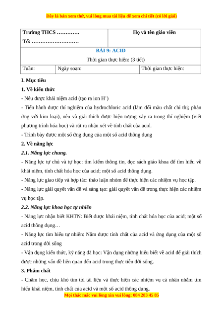 - Năng lực nhận biết KHTN: Biết được khái niệm, tính chất hóa học của acid; một số acid thông dụng…
