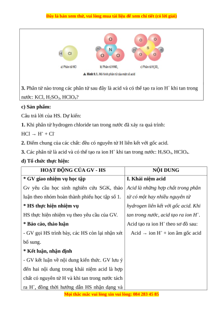 3. Phân tử nào trong các phân tử sau đây là acid và có thể tạo ra ion H+ khi tan trong nước: KCl, H2SO3, HClO4? c) Sản phẩm: