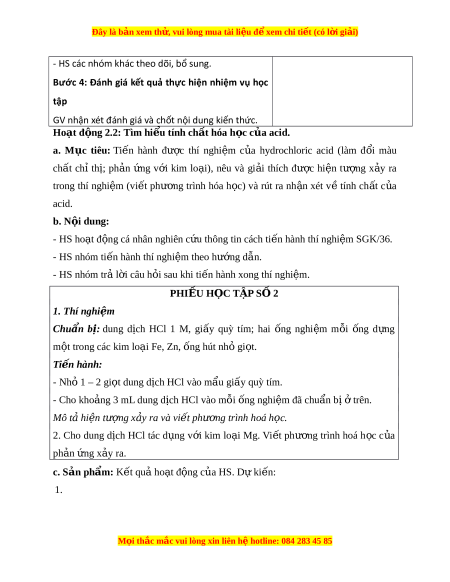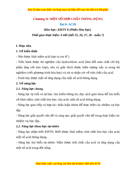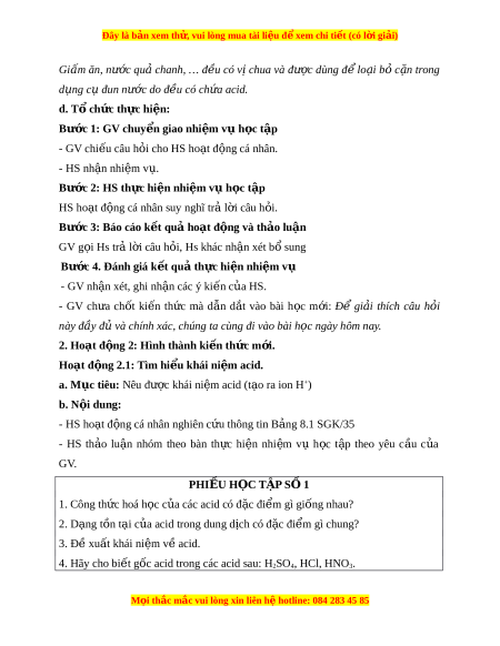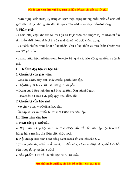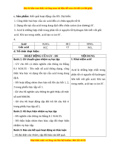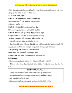 Đây là bản xem th , vu ử i lòng mua tài li u ệ đ xe ể m chi ti t (c ế ó l i ờ gi i ả ) - V n ậ d ng ụ ki n ế th c, ứ kỹ năng đã h c: ọ V n ậ d ng ụ nh ng ữ hi u ể bi t ế về acid để gi i ả thích đư c nh ợ ng v ữ n đ ấ l ề iên quan đ n ế acid trong th c ự ti n ễ đ i ờ s ng. ố 3. Phẩm ch t ấ - Chăm h c, ọ ch u ị khó tìm tòi tài li u ệ và th c ự hi n ệ các nhi m ệ vụ cá nhân nh m ằ tìm hi u khái ể ni m ệ , tính ch t ấ c a aci ủ d và m t ộ s aci ố d thông d ng. ụ - Có trách nhi m ệ trong ho t ạ đ ng ộ nhóm, ch ủ đ ng ộ nh n ậ và th c ự hi n ệ nhi m ệ vụ mà GV yêu cầu. - Trung th c, ự trách nhi m ệ trong báo cáo k t ế quả các h a ọ đ ng ộ và ki m ể ra đánh giá. II. Thi t ế b d ị y h ạ c ọ và h c l ọ i u ệ 1. Chuẩn b c ị a g ủ iáo viên: