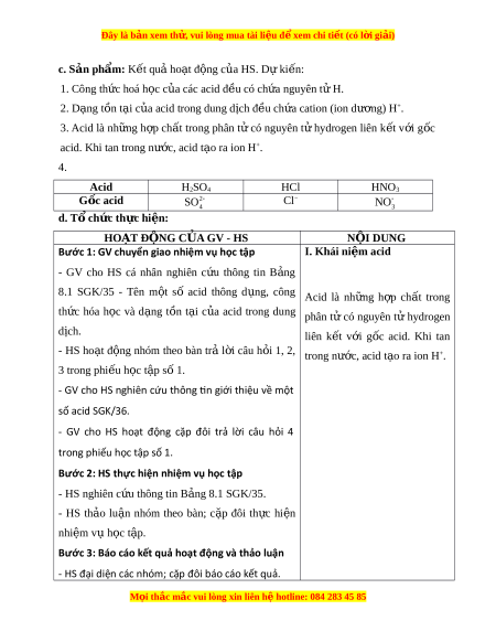 Đây là bản xem th , vu ử i lòng mua tài li u ệ đ xe ể m chi ti t (c ế ó l i ờ gi i ả ) c. Sản phẩm: K t ế quả ho t ạ đ ng ộ c a H ủ S. D ki ự n: ế 1. Công th c hoá h ứ c ọ c a các ủ acid đ u có ch ề a ứ nguyên t H ử . 2. D ng ạ tồn t i ạ c a aci ủ d trong dung d ch đ ị u ch ề a ứ cation (ion dư ng) ơ H+. 3. Acid là nh ng ữ h p ợ ch t ấ trong phân t ử có nguyên t ử hydrogen liên k t ế v i ớ g c ố acid. Khi tan trong nư c, ớ acid t o r ạ a ion H+. 4. Acid H2SO4 HCl HNO3 G c aci ố d 2 SO Cl− NO 4 3 d. T ch ổ ức thực hi n: ệ HOẠT Đ N Ộ G C A Ủ GV - HS N I Ộ DUNG