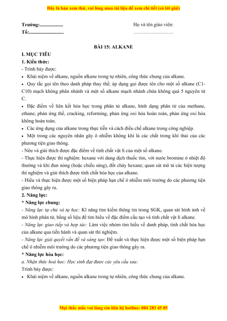 Tổ:............................ …………………… BÀI 15: ALKANE I. MỤC TIÊU 1. Kiến thức: - Trình bày được: