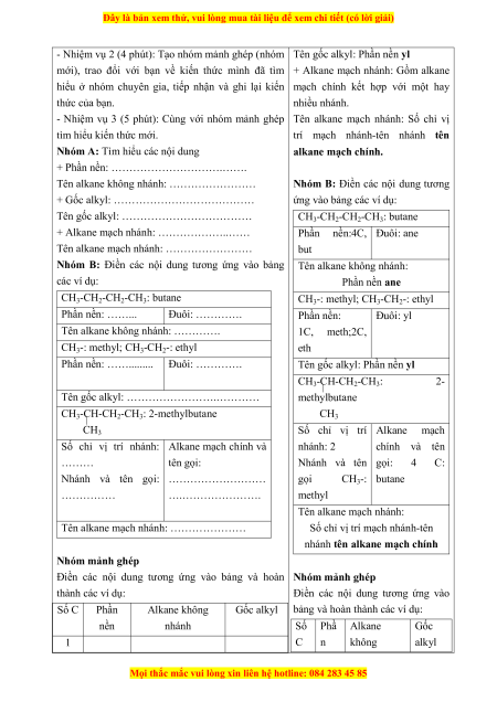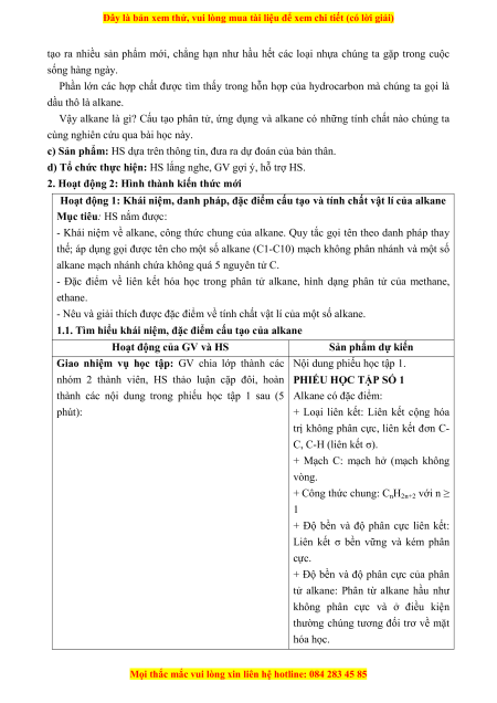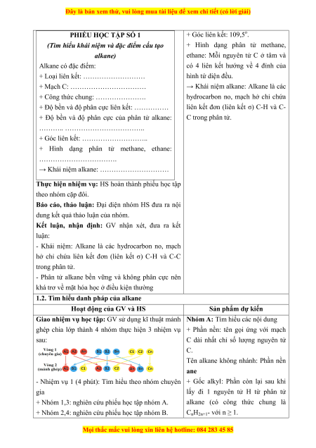 thành các nội dung trong phiếu học tập 1 sau (5 Alkane có đặc điểm: phút):