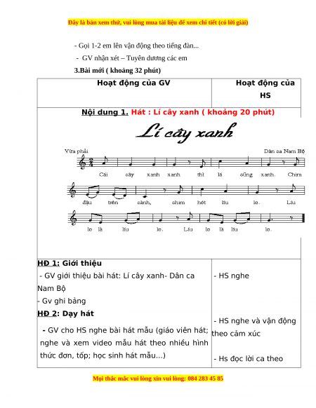 Nội dung 1. Hát : Lí cây xanh ( khoảng 20 phút) HĐ 1: Giới thiệu