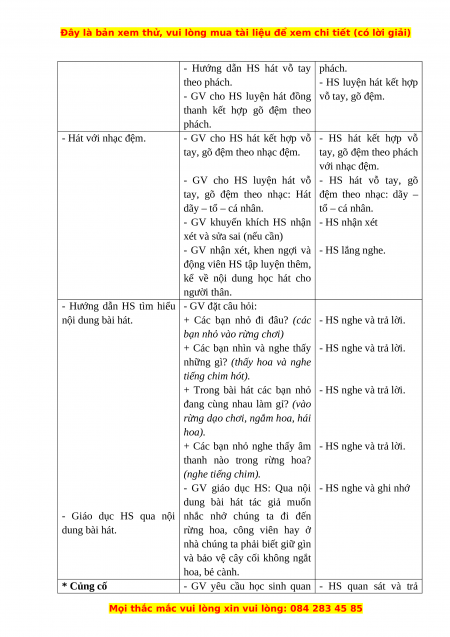 - Hát kết hợp vỗ tay theo - GV hướng dẫn HS hát kết - HS hát vỗ tay theo phách. hợp vỗ tay theo phách: phách theo hướng dẫn của GV. - GV hát vỗ tay mẫu. - HS theo dõi. - HS hát và vỗ tay theo