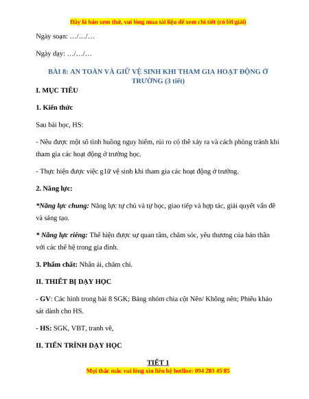 BÀI 8: AN TOÀN VÀ GIỮ VỆ SINH KHI THAM GIA HOẠT ĐỘNG Ở TRƯỜNG (3 tiết) I. MỤC TIÊU 1. Kiến thức Sau bài học, HS: