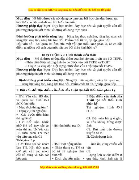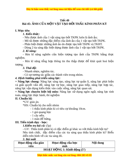 Đây là bản xem th , vu ử i lòng mua tài li u ệ đ xe ể m chi ti t (c ế ó l i ờ gi i ả ) Ti t ế 49 Bài 45: ẢNH C A Ủ M T Ộ VẬT TẠO B I Ở TH U Ấ KÍNH PHÂN KỲ I. M c t ụ iêu 1. Ki n ế th c: ứ - Nêu đư c ợ nh c ả a ủ 1 v t ậ sáng t o b ạ i ở TKPK luôn là nh ả o; ả - Mô tả đư c nh ợ ng ữ đ c đi ặ m ể c a ủ nh ả o ả c a 1 v ủ t ậ t o b ạ i ở TKPK. - Phân bi t ệ đư c nh ợ ng ữ nh ả o do đ ả ư c ợ t o b ạ i ở TKPK và TKHT. - Dùng 2 tia sáng đ c bi ặ t ệ d ng đ ự ư c ợ nh c ả a ủ 1 v t ậ t o ạ b i ở TKPK. 2. Kĩ năng: