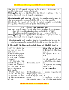 Mục tiêu: - Mô tả đư c nh ợ ng ữ đ c đi ặ m ể c a ủ nh ả o ả c a 1 v ủ t ậ t o b ạ i ở TKPK. - Phân bi t ệ đư c nh ợ ng ữ nh ả o do đ ả ư c ợ t o b ạ i ở TKPK và TKHT. - Dùng 2 tia sáng đ c bi ặ t ệ d ng đ ự ư c ợ nh c ả a ủ 1 v t ậ t o ạ b i ở TKPK. Phư ng ơ pháp d y ạ h c: ọ D y ạ h c ọ nhóm; d y ạ h c ọ nêu và gi i ả quy t ế v n ấ đề; phư ng ơ pháp thuy t ế trình; s d ử ng đ ụ ồ dung tr c ự quan Đ nh h ị ư ng ớ phát tri n năng l ể c ự : Năng l c t ự h c nghi ự m ệ , năng l c quan s ự át, năng l c s ự áng t o, năng l ạ c ự trao đ i ổ . Ph m ẩ ch t ấ t t ự in, t l ự p, ậ giao ti p. ế 1: Đ t ặ v n đ ấ . ề Đặc đi m ể c a ủ nh c ả a 1 v ủ t ậ t o b ạ i ở th u kí ấ nh phân kỳ. - GV: Yêu c u ầ HS đ c ọ I. Đ c ặ đi m ể c a ủ nh ả c a ủ và quan sát hình 45.1 1 vật t o ạ b i ở th u ấ kính SGK tìm hi u: ể phân kỳ + Mục đích thí nghi m ệ ? Thí nghi m ệ : Hình 45.1 + D ng c ụ ụ thí nghi m ệ ? SGK + Các bư c ớ ti n ế hành thí nghiêm? C1: Đ t ặ màn h ng ứ ở g n, ầ - GV: K t ế lu n. ậ Nh c ắ xa đ u ề không h ng ứ đư c ợ nhở HS về quy t c ắ an - HS: tìm hi u, ể tr l ả i ờ . nh. ả toàn khi làm TN.Yêu c u ầ C2: Đ t ặ m t ắ trên đư ng ờ HS ti n ế hành TN theo truy n t ề ia ló. yêu cầu c a ủ câu C1 II. Cách d ng ự nh ả Th i ờ gian: 5 p