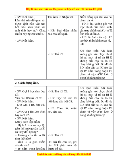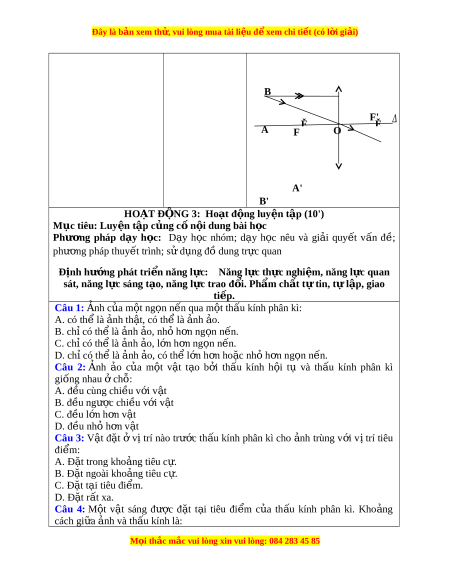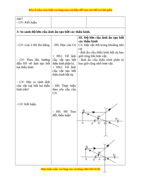 Đây là bản xem th , vu ử i lòng mua tài li u ệ đ xe ể m chi ti t (c ế ó l i ờ gi i ả ) nào? - GV: K t ế lu n. ậ 3: So sánh đ l ộ n c ớ a ủ nh ả o t ả o b ạ i ở các th u kí ấ nh. III. Độ l n ớ c a ủ nh ả o ả t o ạ b i ở các thấu kính - GV: G i ọ 2 HS lên b ng ả - HS: Đ c câu ọ C6 C5: Đ t ặ v t ậ AB trong kho ng ả tiêu cự - nh ả o ả c a ủ th u ấ kính h i ộ t ụ bao + HS1: Vẽ n ả h gi cũng l ờ n h ớ n ơ v t ậ . - GV: Theo dõi, hư n ớ g c a ủ v t ậ t o ạ b i ở - nh ả o ả c a ủ th u ấ kính phân kì d n ẫ HS vẽ n ả h t o ạ b i ở th u ấ kính phân kì. bao gi cũng nh ờ ỏ h n v ơ t ậ . hai th u ấ kính. + HS2: Vẽ n ả h c a ủ v t ậ t o ạ b i ở th u ấ kính h i ộ t . ụ - GV: Hãy so sánh n ả h c a ủ v t ậ toạ b i ở hai th u ấ - HS: Th c ự hi n ệ kính trên? theo yêu c u ầ c a ủ GV. - GV: K t ế lu n ậ . - HS: HS Trao B đ i ổ , th o ả lu n ậ B' F' Ě Ě A F A' O B B F' Ě ' Ě A F A O ' M i ọ thắc m c