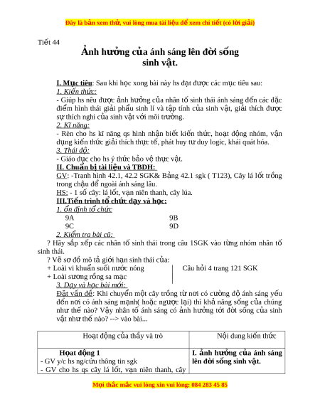 Giáo án Ảnh hưởng của ánh sán lên đời sống sinh vật Sinh học 9