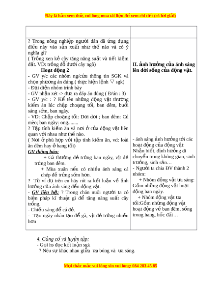 ệ ? Trong chăn nuôi ngư i ờ ta có đ ng ộ ban ngày. biện pháp kĩ thu t ậ gì để tăng năng su t ấ cây + Nhóm đ ng v ộ t ậ a ư trồng. tối:Gồm nh ng ữ đ ng v ộ t ậ - Chi u s ế áng đ cá ể đ . ẻ ho t ạ đ ng v ộ ban đêm ề , sống - T o ạ ngày nhân t o ạ để gà, v t ị đẻ tr ng ứ nhi u ề trong hang, hốc đ t ấ … h n ơ 4. C ng ủ cố và luy n t ệ p: ậ - G i ọ hs đ c k ọ t ế lu n ậ sgk ? Nêu s khác ự nhau gi a ữ a bóng và ư a s ư áng. M i ọ thắc m c