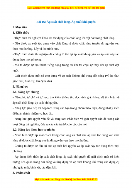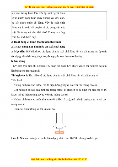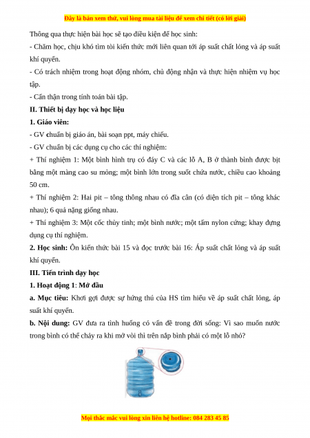 2. Học sinh: Ôn kiến thức bài 15 và đọc trước bài 16: Áp suất chất lỏng và áp suất