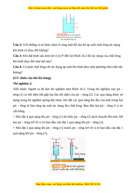 Câu 3: Khi đặt bình sâu hơn (từ vị trí P đến Q) Hình 16.2 thì tác dụng của chất lỏng