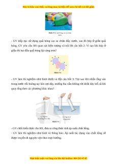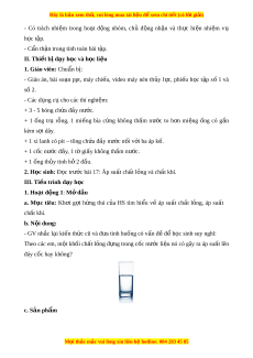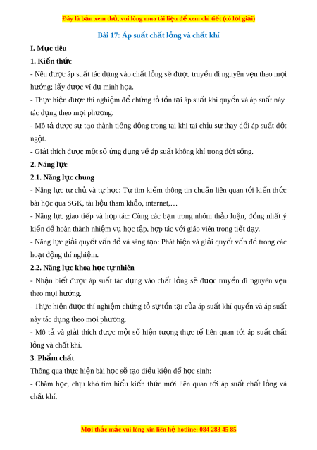 ệ đ xe ể m chi ti t ế (có l i ờ gi i ả ) Bài 17: Áp su t ấ ch t ấ l ng và ch ỏ t ấ khí I. M c t ụ iêu 1. Ki n t ế h c ứ - Nêu đư c ợ áp su t ấ tác d ng ụ vào ch t ấ l ng ỏ s ẽ đư c ợ truy n ề đi nguyên v n ẹ theo m i ọ hư ng; ớ lấy đư c ợ ví d m ụ inh h a. ọ - Th c hi ự n đ ệ ư c ợ thí nghi m ệ đ ch ể ng ứ t t ỏ n t ồ i ạ áp su t ấ khí quy n và áp s ể u t ấ này tác d ng t ụ heo m i ọ phư ng. ơ - Mô tả đư c ợ sự t o ạ thành ti ng ế đ ng ộ trong tai khi tai ch u ị s ự thay đ i ổ áp su t ấ đ t ộ ng t ộ . - Gi i ả thích đư c ợ m t ộ s ố ng d ứ ng v ụ ề áp su t ấ không khí trong đ i ờ s ng. ố 2. Năng l c ự 2.1. Năng l c chung ự - Năng l c ự tự chủ và tự h c: ọ Tự tìm ki m ế thông tin chu n ẩ liên quan t i ớ ki n ế th c ứ bài h c ọ qua SGK, tài li u t ệ ham kh o, i ả nternet,… - Năng l c ự giao ti p ế và h p ợ tác: Cùng các b n ạ trong nhóm th o ả lu n, ậ đ ng ồ nh t ấ ý ki n đ ế ể hoàn thành nhi m ệ vụ h c t ọ p, h ậ p ợ tác v i ớ giáo viên trong ti t ế d y ạ . - Năng l c gi ự i ả quy t ế v n đ ấ và s ề áng t o: ạ Phát hi n và gi ệ i ả quy t ế v n đ ấ t ề rong các ho t ạ đ ng t ộ hí nghi m ệ . 2.2. Năng l c khoa h ự c t ọ nhi ự ên - Nh n ậ bi t ế đư c ợ áp su t ấ tác d ng ụ vào ch t ấ l ng ỏ sẽ đư c ợ truy n ề đi nguyên v n ẹ theo m i ọ hư ng. ớ - Th c ự hi n ệ đư c ợ thí nghi m ệ ch ng ứ t ỏ s ự t n ồ t i ạ c a ủ áp su t ấ khí quy n ể và áp su t ấ này tác d ng t ụ heo m i ọ phư ng. ơ - Mô tả và gi i ả thích đư c ợ m t ộ số hi n ệ tư ng ợ th c ự tế liên quan t i ớ áp su t ấ ch t ấ l ng và ỏ ch t ấ khí. 3. Phẩm ch t ấ Thông qua th c hi ự n bài ệ h c s ọ ẽ t o đi ạ u ki ề n đ ệ h ể c ọ sinh: - Chăm h c, ọ ch u ị khó tìm hi u ể ki n ế th c ứ m i ớ liên quan t i ớ áp su t ấ ch t ấ l ng ỏ và chất khí. M i