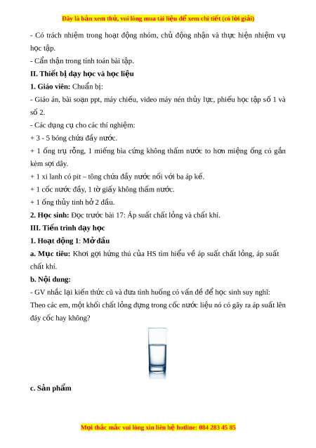 + 1 xi lanh có pit – tông ch a ứ đ y n ầ ư c ớ n i ố v i ớ ba áp k . ế + 1 cốc nư c ớ đ y ầ , 1 tờ gi y không t ấ h m ấ nư c. ớ + 1 ống th y t ủ inh h 2 đ ở u. ầ 2. H c ọ sinh: Đ c ọ trư c ớ bài 17: Áp su t ấ ch t ấ l ng và ch ỏ t ấ khí. III. Ti n t ế rình d y h ạ c ọ 1. Hoạt đ ng 1 ộ : M đ ở ầu a. Mục tiêu: Kh i ơ g i ợ h ng ứ thú c a ủ HS tìm hi u ể về áp su t ấ ch t ấ l ng, ỏ áp su t ấ chất khí. b. N i ộ dung: - GV nh c l ắ i ạ ki n ế th c cũ và đ ứ a ư tình hu ng có v ố n đ ấ đ ề h ể c ọ sinh suy nghĩ: Theo các em, m t ộ kh i ố ch t ấ l ng ỏ đ ng t ự rong c c ố nư c ớ li u nó ệ có gây ra áp su t ấ lên đáy cốc hay không? c. Sản phẩm M i