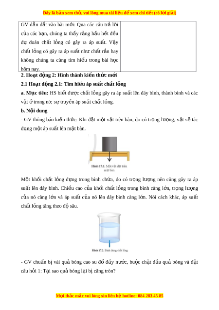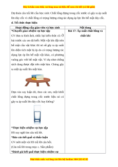ệ đ xe ể m chi ti t ế (có l i ờ gi i ả ) Dự đoán câu trả l i ờ c a ủ h c ọ sinh: Ch t ấ l ng ỏ đ ng t ự rong c c ố nư c ớ có gây ra áp su t ấ lên đáy cốc vì ch t ấ l ng có ỏ tr ng l ọ ư ng ợ cũng tác d ng áp l ụ c ự lên b m ề t ặ đáy c c. ố d. T ch ổ ức thực hi n ệ Hoạt đ ng c ộ a gi ủ áo viên và h c s ọ inh N i ộ dung *Chuy n gi ể ao nhi m ệ v h ụ c t ọ p ậ Bài 17: Áp su t ấ ch t ấ l ng và ỏ GV đ a r ư a hình nh, nh ả c ắ l i ạ ki n ế th c ứ cũ: Ở chất khí bài trư c ớ các em đã bi t ế : M t ộ v t ậ khi đ t ặ trên bề m t ặ c a ủ v t