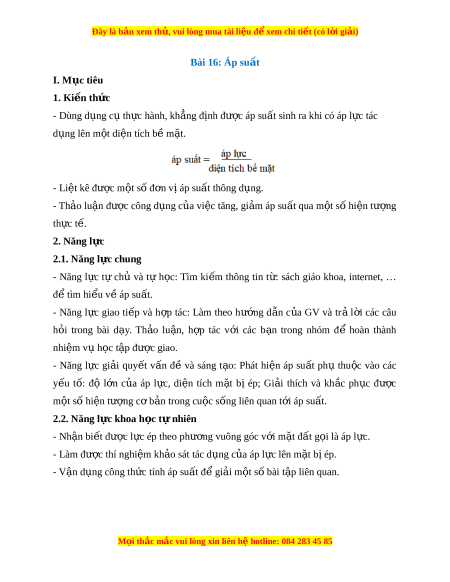 ệ đ xe ể m chi ti t ế (có l i ờ gi i ả ) Bài 16: Áp su t ấ I. M c t ụ iêu 1. Ki n t ế h c ứ - Dùng d ng c ụ t ụ h c ự hành, kh ng đ ẳ nh đ ị ư c ợ áp su t ấ sinh ra khi có áp l c ự tác d ng l ụ ên m t ộ di n t ệ ích bề m t ặ . - Li t ệ kê đư c ợ m t ộ s đ ố n v ơ áp s ị u t ấ thông d ng. ụ - Th o l ả u n ậ đư c công ợ d ng c ụ a vi ủ c t ệ ăng, gi m ả áp su t ấ qua m t ộ s hi ố n t ệ ư ng ợ th c ự t . ế 2. Năng l c ự 2.1. Năng l c chung ự - Năng l c ự tự chủ và tự h c: ọ Tìm ki m ế thông tin t :