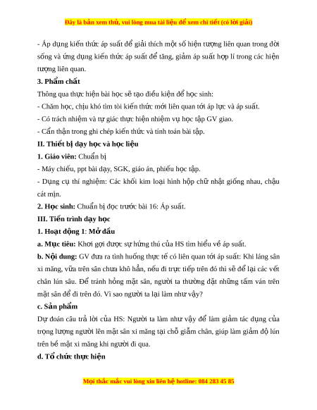 ệ đ xe ể m chi ti t ế (có l i ờ gi i ả ) - Áp d ng ụ ki n ế th c ứ áp su t ấ đ ể gi i ả thích m t ộ s ố hi n ệ tư ng ợ liên quan trong đ i ờ sống và ng ứ d ng ụ ki n ế th c ứ áp su t ấ đ ể tăng, gi m ả áp su t ấ h p ợ lí trong các hi n ệ tư ng ợ liên quan. 3. Phẩm ch t ấ Thông qua th c hi ự n bài ệ h c s ọ ẽ t o đi ạ u ki ề n đ ệ h ể c ọ sinh: - Chăm h c, ọ ch u khó t ị ìm tòi ki n t ế h c ứ m i ớ liên quan t i ớ áp l c và ự áp su t ấ . - Có trách nhi m ệ và t gi ự ác th c ự hi n nhi ệ m ệ v h ụ c ọ t p G ậ V giao. - Cẩn th n t ậ rong ghi chép ki n t ế h c ứ và tính toán bài t p. ậ II. Thi t ế b d ị y h ạ c ọ và h c l ọ i u ệ