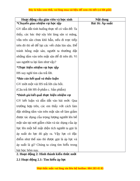 ế quả và th o l ả u n ậ GV m i ờ m t ộ vài HS tr l ả i ờ câu h i ỏ . (Câu tr l ả i ờ HS ở ph n c. ầ S n ph ả m ẩ ) *Đánh giá k t ế qu t ả h c hi ự n nh ệ i m ệ vụ GV k t ế lu n ậ và d n ẫ d t ắ vào bài m i ớ : Qua trư ng ờ h p ợ trên, các em th y ấ v i ớ cách làm đ t ặ nh ng ữ t m ấ ván trên m t ặ sân sẽ làm gi m ả đư c ợ tác d ng ụ c a ủ tr ng ọ lư ng ợ ngư i ờ lên bề m t ặ sân t i ạ n i ơ gi m ẫ chân và tác d ng ụ c a ủ áp l c ự lên m t ộ bề m t ặ di n ệ tích ngư i ờ ta g i ọ là áp su t ấ do l c ự đó gây ra. V y ậ l c ự có đ c ặ đi m