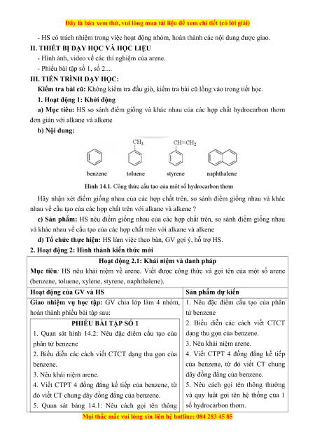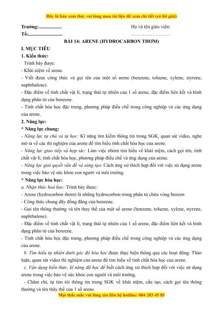 BÀI 14: ARENE (HYDROCARBON THƠM) I. MỤC TIÊU 1. Kiến thức: Trình bày được: - Khái niệm về arene.