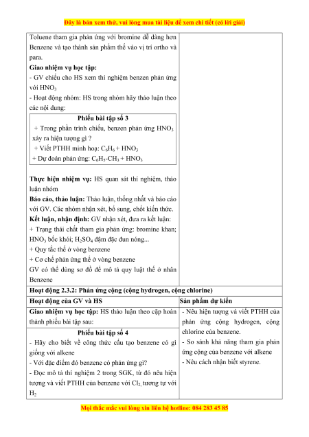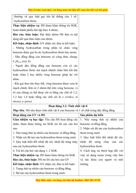 nhân, tham khảo thông tin SGK trả lời các câu hỏi benzene và đồng đẳng. sau: