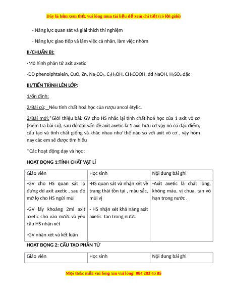 -Phương pháp điều chế axit axetic bằng cách lên men ancol etylic. 2/Kĩ năng: