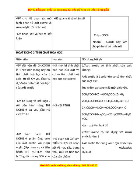 (kiểm tra bài cũ), sau đó đặt vấn đề axit axetic là 1 axit hữu cơ vậy nó có đặc điểm,