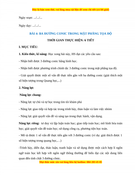 BÀI 4: BA ĐƯỜNG CONIC TRONG MẶT PHẲNG TỌA ĐỘ