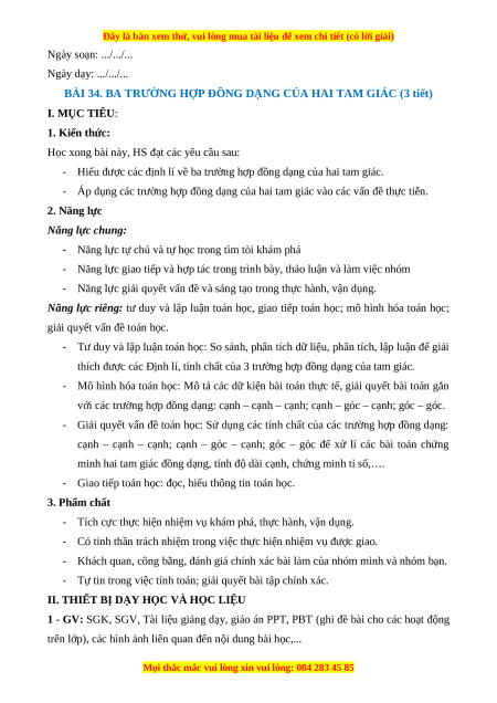 BÀI 34. BA TRƯỜNG HỢP ĐỒNG DẠNG CỦA HAI TAM GIÁC (3 tiết) I. MỤC TIÊU:
