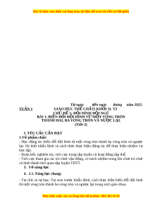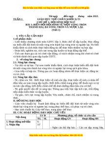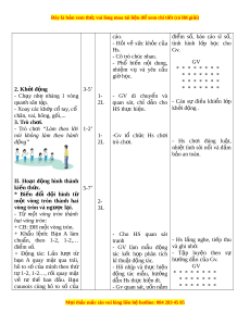 ộ vòng tròn thành hai vòng tròn và ngư c l ợ i ạ trong sách giáo khoa. - Giao ti p ế và h p ợ tác: Thông qua các ho t ạ đ ng ộ nhóm đ t ể h c ự hi n ệ các đ ng ộ tác và trò ch i ơ . 2.2. Năng l c đ ự c t ặ hù: - NL chăm sóc SK: Bi t ế th c ự hi n ệ v ệ sinh sân t p, ậ th c ự hi n ệ v ệ sinh cá nhân để đ m ả b o ả an toàn trong t p ậ luy n. ệ Bi t ế đi u ề ch nh ỉ trang ph c ụ đ ể tho i ả mái và tự tin khi v n ậ đ ng, bi ộ t ế đi u ch ề nh ch ỉ đ ế di ộ nh dư ng ỡ đ m ả b o ả cho c t ơ h . ể - NL gi i ả quy t ế v n ấ dề và sáng t o: ạ Thông qua vi c ệ h c ọ t p ậ tích c c, ự ch ủ đ ng ộ ti p nh ế n ậ ki n t ế h c và t ứ p ậ luy n. ệ - Tự giác, tích c c ự trong t p ậ luy n; ệ Yêu nư c, ớ chăm ch ,ỉ trách nhi m ệ và trung th c. ự II. Đ D Ồ ÙNG D Y Ạ H C Ọ - Giáo viên chu n ẩ b : ị Tranh nh ả đ ng ộ tác bi n ế đổi đ i ộ hình từ m t ộ vòng tròn