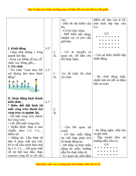 Đây là bản xem th , vu ử i lòng mua tài li u ệ đ xe ể m chi ti t (c ế ó l i ờ gi i ả ) cáo. đi m ể số, báo cáo sĩ s , ố - H i ỏ về s c ứ kh e ỏ c a ủ tình hình l p ớ h c ọ cho Hs. Gv. - Cô trò chúc nhau. - Phổ bi n ế n i ộ dung, GV nhiệm vụ và yêu c u ầ * * * * * * * * gi h ờ c. ọ * * * * * * * * * * * * * * 2. Kh i ở đ ng ộ 3-5’ * * * * * * * - Ch y ạ nhẹ nhàng 1 vòng 1- - GV di chuy n ể và quanh sân t p. ậ 2L quan sát, chỉ d n ẫ cho - Cán sự đi u ề khi n ể l p ớ - Xoay các kh p c ớ ổ tay, cổ HS th c hi ự n. ệ kh i ở đ ng ộ . chân, vai, hông, gối,... 3. Trò ch i ơ . - Trò ch i ơ “Làm theo l i ờ 1-2’