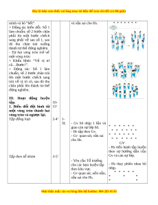 vòng tròn và ngư c l ợ ại. 3L - Từ m t ộ vòng tròn thành hai vòng tròn: + CB: ĐH m t ộ vòng tròn. + Kh u ẩ l nh: ệ B n ạ A làm - Cho HS quan sát chuẩn, theo 1-2, 1-2,… tranh - Hs l ng ắ nghe, ti p ế thu đi m ể số. - GV làm m u ẫ đ ng ộ và ghi nh . ớ + Đ ng ộ tác: L n ầ lư t ợ từ tác k t ế h p ợ phân tích - T p ậ luy n ệ theo sự b n ạ A quay m t ặ qua trái, kĩ thu t ậ đ ng t ộ ác. hư ng ớ d n c ẫ a ủ Gv. hô to số c a ủ mình theo thứ - Hô nh p ị và th c ự hi n ệ GV tự 1-2, 1-2…, r i ồ quay m t ặ đ ng ộ tác m u, ẫ hư ng ớ * * * * * * * * về tư thế ban đ u. ầ B n ạ dẫn Hs th c hi ự n đt ệ . * * * * * * * cuuoois cùng hô to số c a ủ - Gv quan sát, u n n ố m ắ * * * * * * * M i