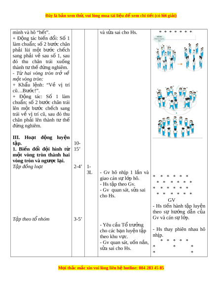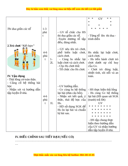 Đây là bản xem th , vu ử i lòng mua tài li u ệ đ xe ể m chi ti t (c ế ó l i ờ gi i ả ) * * GV * * * * * * * Thi đua gi a ữ các t ổ 1-3 * * * * * phú - GV tổ ch c ứ cho HS t thi đua gi a ữ các tổ. - T ng t ừ ổ lên thi đua - -Tuyên dư ng ơ tổ t p ậ trình di n ễ đ u, đúng nh ề ất. 2.Trò ch i ơ “K t ế b n” ạ - GV nêu tên trò ch i ơ , 4-6 phổ bi n ế lu t ậ ch i ơ , Hs nh c ắ l i ạ lu t ậ ch i ơ , phú cách ch i ơ . cách ch i ơ . t 1- - Cùng hs nh c ắ l i ạ - Hs ti n ế hành ch i ơ trò 2L lu t ậ ch i ơ và cách ch i ơ . ch i ơ dư i ớ sự chỉ huy - Cho Hs ch i ơ th . ử c a ủ Gv. - Tổ ch c cho H ứ s ch i ơ . - Ch i ơ trò đúng lu t ậ , nhiệt tình, sôi n i ổ và an IV. Vận dụng toàn. - Thả l ng c ỏ t ơ oàn thân. - C ng ủ cố hệ th ng ố bài h c ọ - GV hư ng d ớ n. ẫ - Nh n ậ xét và hư ng ớ d n ẫ - Gv cùng hs hệ th ng ố - HS th c hi ự n t ệ h l ả ng ỏ t p l ậ uyện nhà. ở l i ạ bài (đ a ư câu h i ỏ ). - Hs cùng Gv hệ th ng ố 4-6 - Nh n ậ xét k t ế qu , ả ý l i ạ bài (HS quan sát SGK phú th c, ứ thái độ h c ọ c a ủ (tranh) tr l ả i ờ ) t 1L Hs. GV - HD sử d ng ụ SGK để * * * * * * * * Hs ôn l i ạ bài và chu n ẩ * * * * * * * bị bài sau. * * * * * * * * * * * * * * - HS t p chung t ậ h c ự hiện theo hư ng ớ d n ẫ c a ủ GV và nh n h ậ ư ng ớ dẫn t p l ậ uyện nhà. ở IV. ĐIỀU CH N Ỉ H SAU TI T Ế D Y Ạ ( N U Ế CÓ)