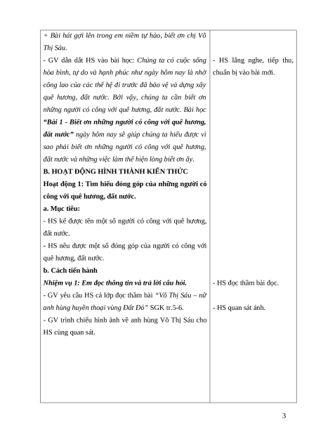 - GV trình chiếu hình ảnh về anh hùng Võ Thị Sáu cho HS cùng quan sát. 3 - HS lắng nghe GV nêu câu